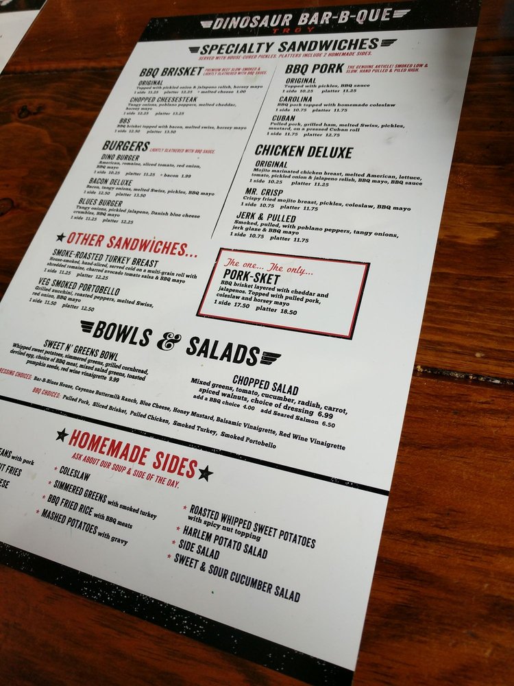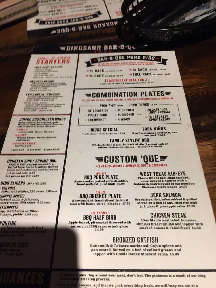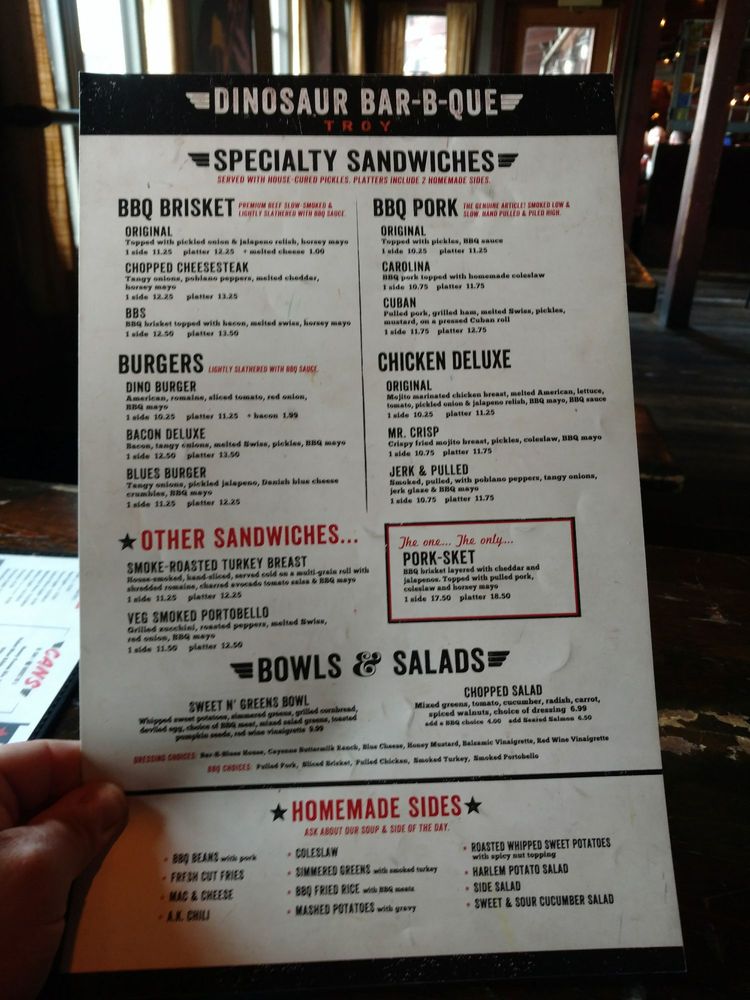 Dinosaur Bar-B-Que in Troy, NY offers a diverse range of options, including shared plates like BBQ Pork Sliders and Creole Spiced Deviled Eggs. The BarBQue Bowl and Chopped Salad are popular choices for a lighter meal. Customers rave about the flavorful brisket and the ample portions. The restaurant's picturesque riverside location and relaxed atmosphere make it a great spot for groups or casual dining. With friendly service and a variety of beverages available, including specialty sodas and root beer, Dinosaur Bar-B-Que provides a memorable dining experience. Don't miss out on their must-try fried green tomatoes and fish and chips with a kick of habanero cocktail sauce.